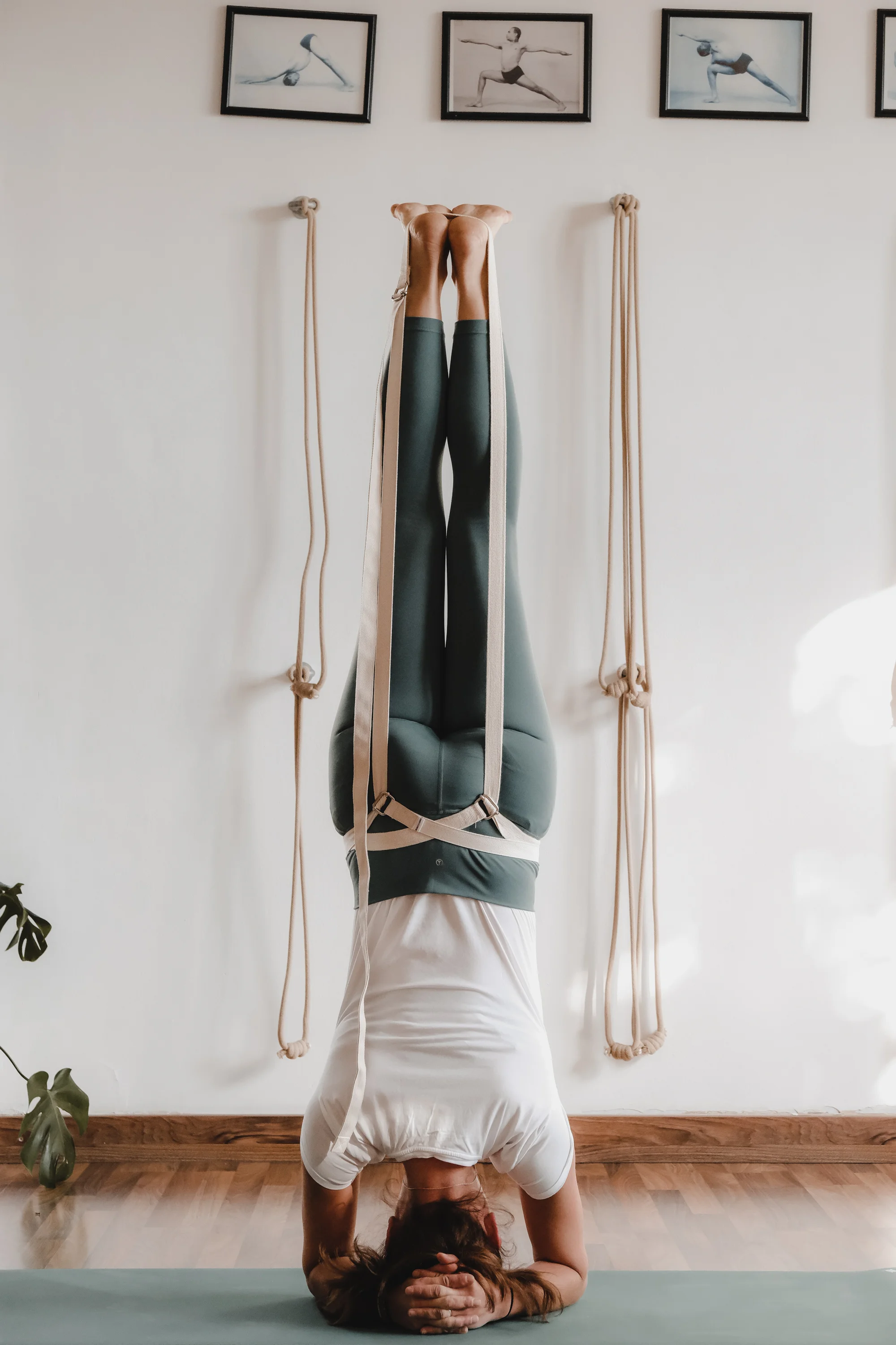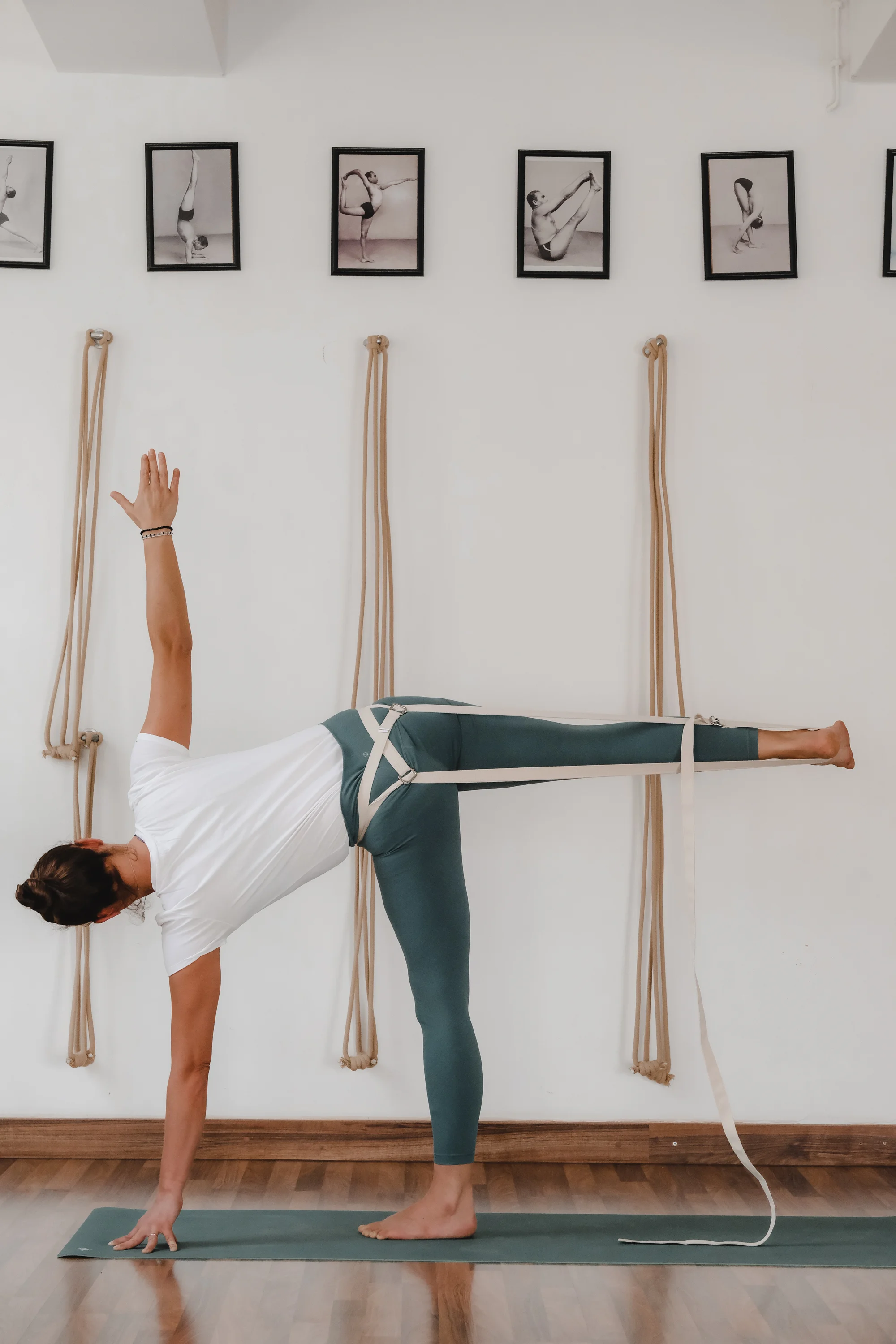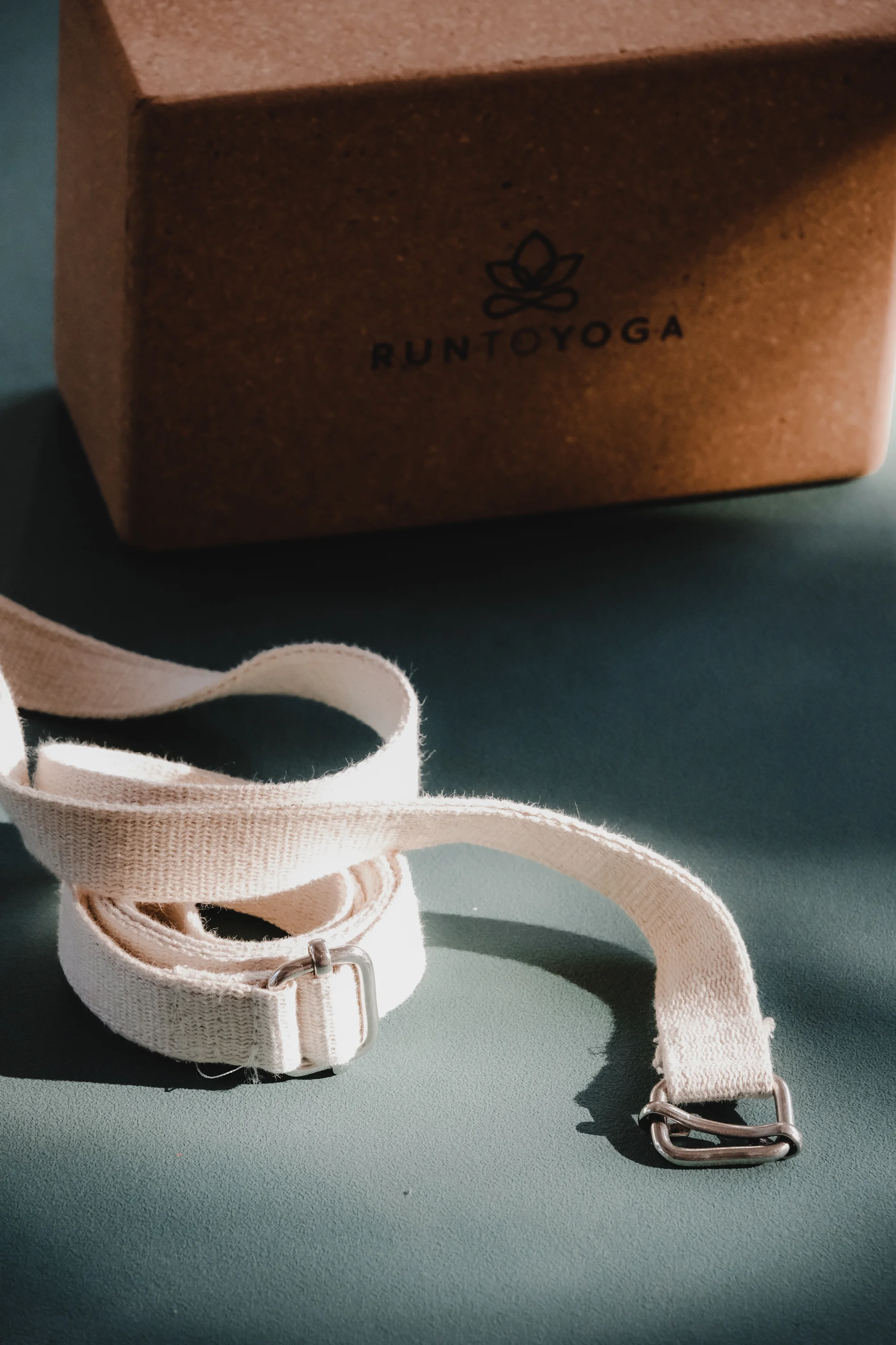 The RunToYoga Double Buckle Belt is an advanced Iyengar yoga prop designed for precise pelvic work and spinal release. Used together with a standard yoga belt, it forms an adjustable loop around the hips and feet. When gently tightened, it guides the sacrum downward, relieving tension in the lower back and creating a sense of grounded length.